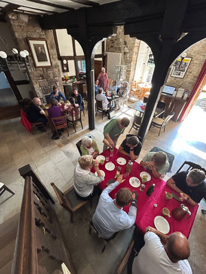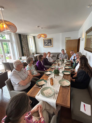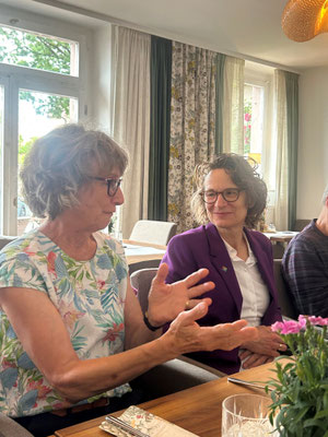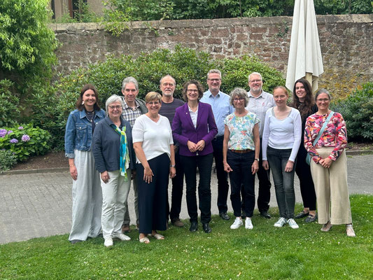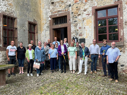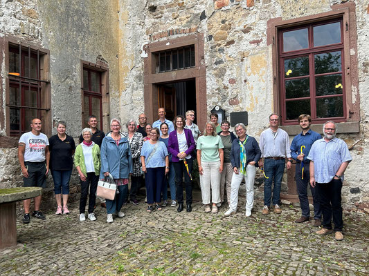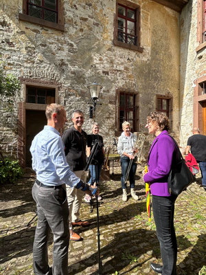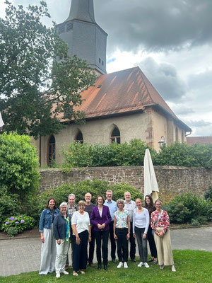 In der Burgenstadt Schlitz wartete eine ganz Abordnung von Pfarrpersonen und Ehrenamtlichen, die sich bei einem Mittagessen in der Vorderburg insbesondere über das Thema Kirche auf dem Land austauschten. Viele Ehrenamtliche, u.a. aus dem Kindergottesdienst, verschiedenen Gruppen und dem Lektorendienst, sowie die Pfarrpersonen vor Ort – Pfarrer Gerrit Boomgaarden, Pfarrerin Melanie Pflanz und Pfarrerin Hannah Schnegelberger – freuten sich, mit der neuen Kirchenpräsidentin sehr angeregte und interessierte Gespräch zu kommen. Sie lernte verschiedene Gottesdienstformate kennen und erfuhr, wie sehr das Engagement der Gemeindeglieder eine Gemeinde tragen kann. „Wir sind da, wo die Menschen sind“; fasste Prädikant Hagen Köckeritz einen Ansatz zusammen, der – wie die Gottesdienstzahlen belegen – im Schlitzerland durchaus vielversprechend ist. Sehr beeindruckt zeigte sich die Kirchenpräsidentin von dem Miteinander der Haupt- und Ehrenamtlichen, das auf „Wertschätzung und Vertrauen“ beruhe, wie Pfarrerin Pflanz sagte. Das Lektoren-Ehepaar Stephan Möller und Ute Spöhrer-Möller sprach über seine Motivation, verschiedene Formate – wie etwa das wöchentliche Friedensgebet – anzubieten: Die Kraft komme aus guten Nachrichten, aus der Idee, dass Beten helfe. Es gab noch weitere inhaltliche Themen, z.B. den Status als alte Grafschaft, der heute noch für Zusammenhalt sorge.
