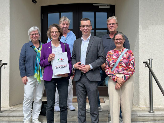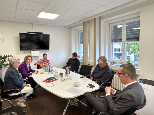 Den ersten Stopp gab es daher im Lauterbacher Landratsamt. Hier wurden die drei Besucherinnen vom stellvertretenden Landrat und Erstem Kreisbeigeordneten Patrick Krug, vom Jugendamtsleiter Helmut Benner und Sachgebietsleiterin Silvia Lucas begrüßt. Die Kirchenpräsidentin lernte hier die anhaltende, vertrauensvolle und fruchtbare Zusammenarbeit der Kreisverwaltung und der Dekanatsleitung kennen: Besonders im Bereich der Schulbezogenen Jugendsozialarbeit, der Arbeit mit Kindern und Jugendlichen sowie der Demokratieförderung haben die beiden Organisationen Berührungspunkte. Krug lobte den regelmäßigen Austausch und die Kooperation mit dem Dekanat. „Ländliche Räume kennenlernen erweitert den Blick“, freute sich der stellvertretende Landrat über die Initiative der Kirchenpräsidentin, sich den Themen des Vogelsbergs zu stellen. Silvia Lucas blickte zurück auf die Anfänger der jahrzehntelangen Kooperation und berichtete von aktuellen gemeinsamen Demokratie-Projekten. Helmut Benner ging spezifischer u.a. auf die inklusive Arbeit in den Kitas ein, die gerade im Vogelsberg sehr entbürokratisiert wurde – zur Freue aller Beteiligten. Alle evangelischen Kitas im Kreis (und zwei von außerhalb) werden ab dem nächsten Jahr aller Voraussicht nach in der GüT verwaltet – eine bisher einzigartige Entwicklung in der EKHN, die auch zeigt, wie gut die Vernetzung zwischen Kirche und Kommunen ist.