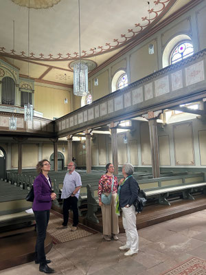Dekanin Dr. Dorette Seibert und ihre Stellvertreterin Luise Berroth hatten eine veritable „Tour de Vogelsberg“ für sie vorbereitet, denn: Das Evangelische Dekanat Vogelsberg ist das flächengrößte der EKHN, schon einzelne Nachbarschaftsräume sind größer als beispielsweise die Dekanate Mainz oder Kronberg. Dünn besiedelt zwar, aber mit über hundert historischen Kirchen, 19 Kommunen und 150 Orten eine Herausforderung. Genau das wollten die Dekanatsleiterinnen der Kirchenpräsidentin nahebringen – nicht nur, aber auch, weil die ländlichen Gebiete gerade in letzter Zeit sehr unter synodalen Beschlüssen aus Darmstadt leiden: „Die Entfernungen werden von Menschen, die städtische Gebiete als Maßstab nehmen, nicht gesehen“; beklagte die Dekanin, dabei seien im Vogelsberg die Menschen der Kirche nach wie vor sehr verbunden. Im Verlauf des Besuchs wurde deutlich: „Hier macht es einen Unterschied, ob eine Vikarin da ist, hier wird sie gesehen und erkannt, hier hat sie tun.“